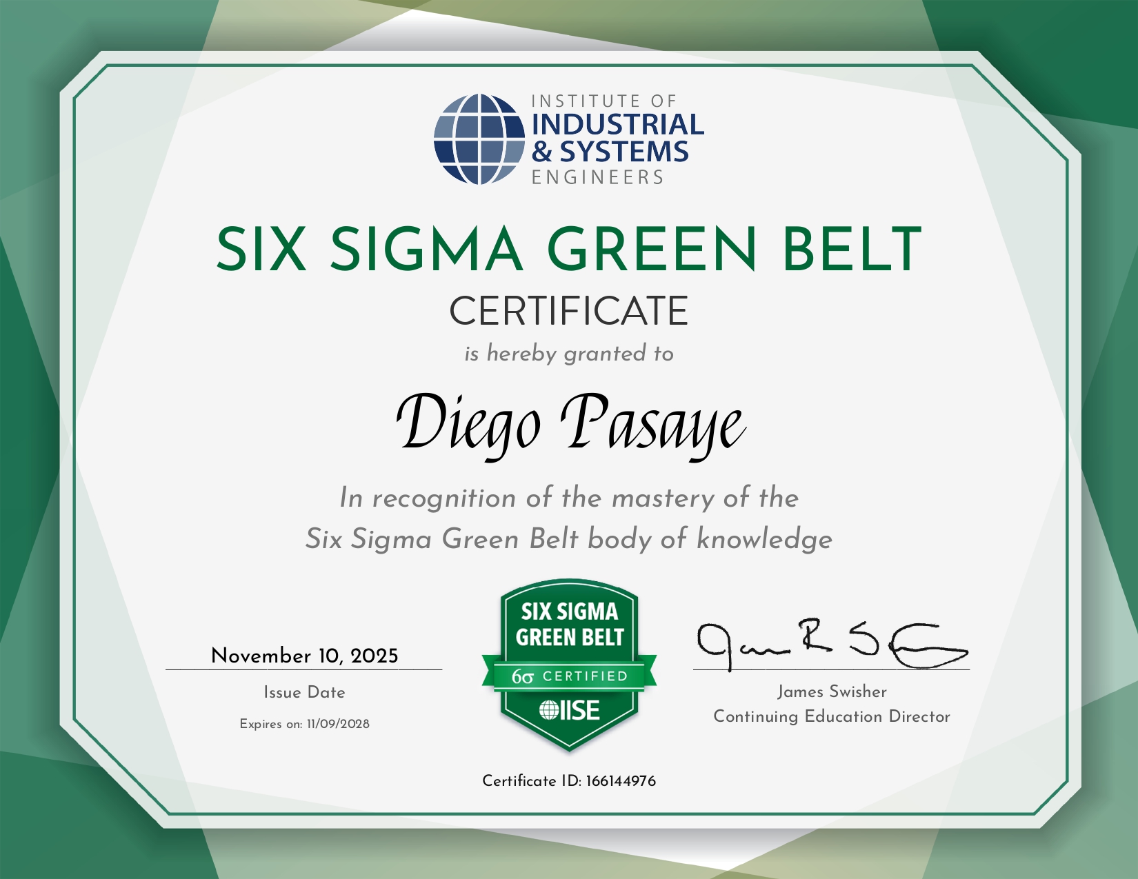 Recognized as an individual that possesses a thorough understanding of enhanced problem-solving skills, with an emphasis on the DMAIC (Define, Measure, Analyze, Improve and Control) model. The Green Belt Certification designation also reflects the knowledge by the individual to serve as a trained team member within his or her function-specific area of the organization.